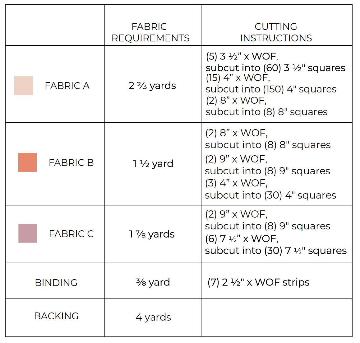 - Width of fabric (WOF) must be at least 42". If it is less than 42", you may need more yardage.